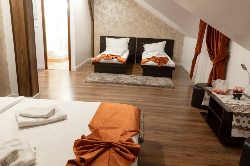 Descoperă liniștea și frumusețea autentică a Maramureșului în camerele noastre triple, amenajate cu grijă pentru confort și relaxare. Fiecare cameră oferă o atmosferă